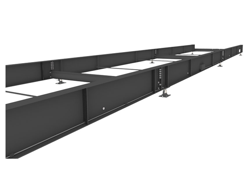 - Estrutura: A plataforma de pesagem é composta por vigas longitudinais paralelas em perfil “I” de aço ASTM A572 GRAU 50, certificado pela Açominas S/A, com pontaletes soldados nas laterais e chapas de fechamento soldadas nas partes frontais.