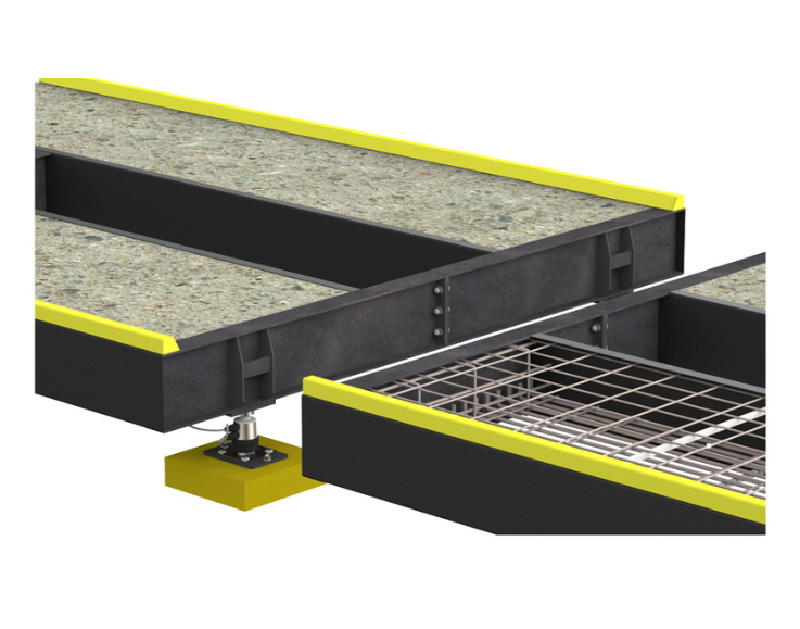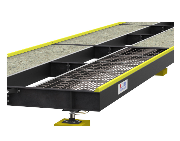 Sistema de ajuste de oscilação das plataformas bidirecional com sistema de limitador em V garantindo uma oscilação suave e ajuste milimétrico, minimizando os desgastes dos acopladores das células de carga e evitando a quebra de batentes por frenagens mais bruscas que eventualmente possa surgir. Obra civil com uma economia de até 50%, pois a estrutura das balanças é projetada para suportar as cargas aplicadas sem a necessidade de o cliente aumentar as ferragens e concreto da plataforma para ajustar-se ao projeto.