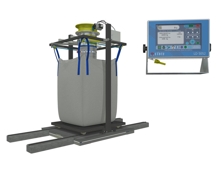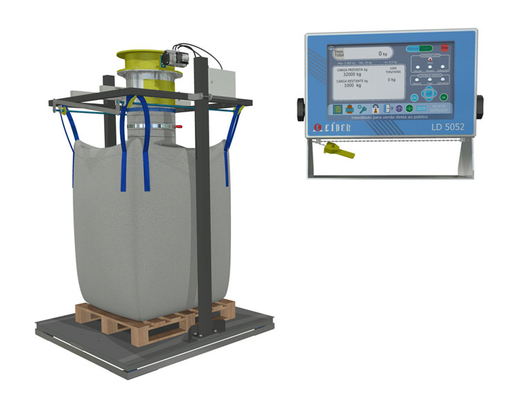 Enchimento do bag é realizado sobre a balança sendo o modo de fixação do Bag através de ganchos articulados de engate Rápido sustentação e liberação simultânea das alças, permitindo a retirada direto por empilhadeira com bag sobre palete.