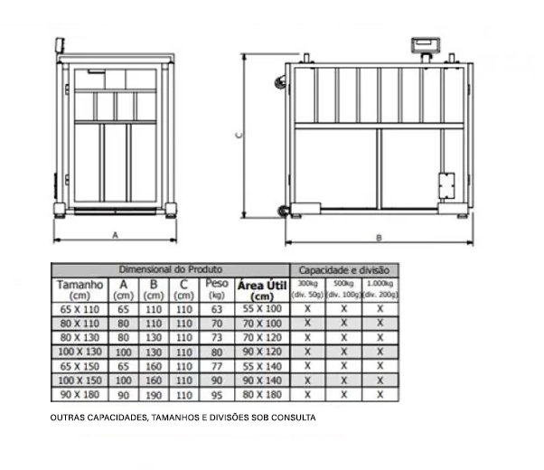 | Capacidade Nominal | 300kg / 500kg (outras capacidades sob consulta). |