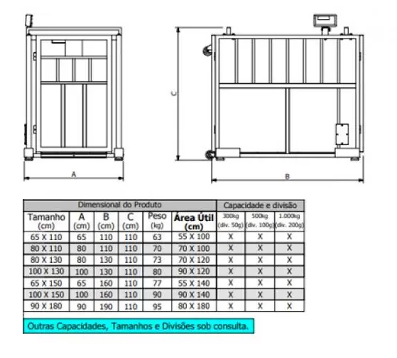| Capacidade Nominal | 300kg / 500kg (outras capacidades sob consulta) |