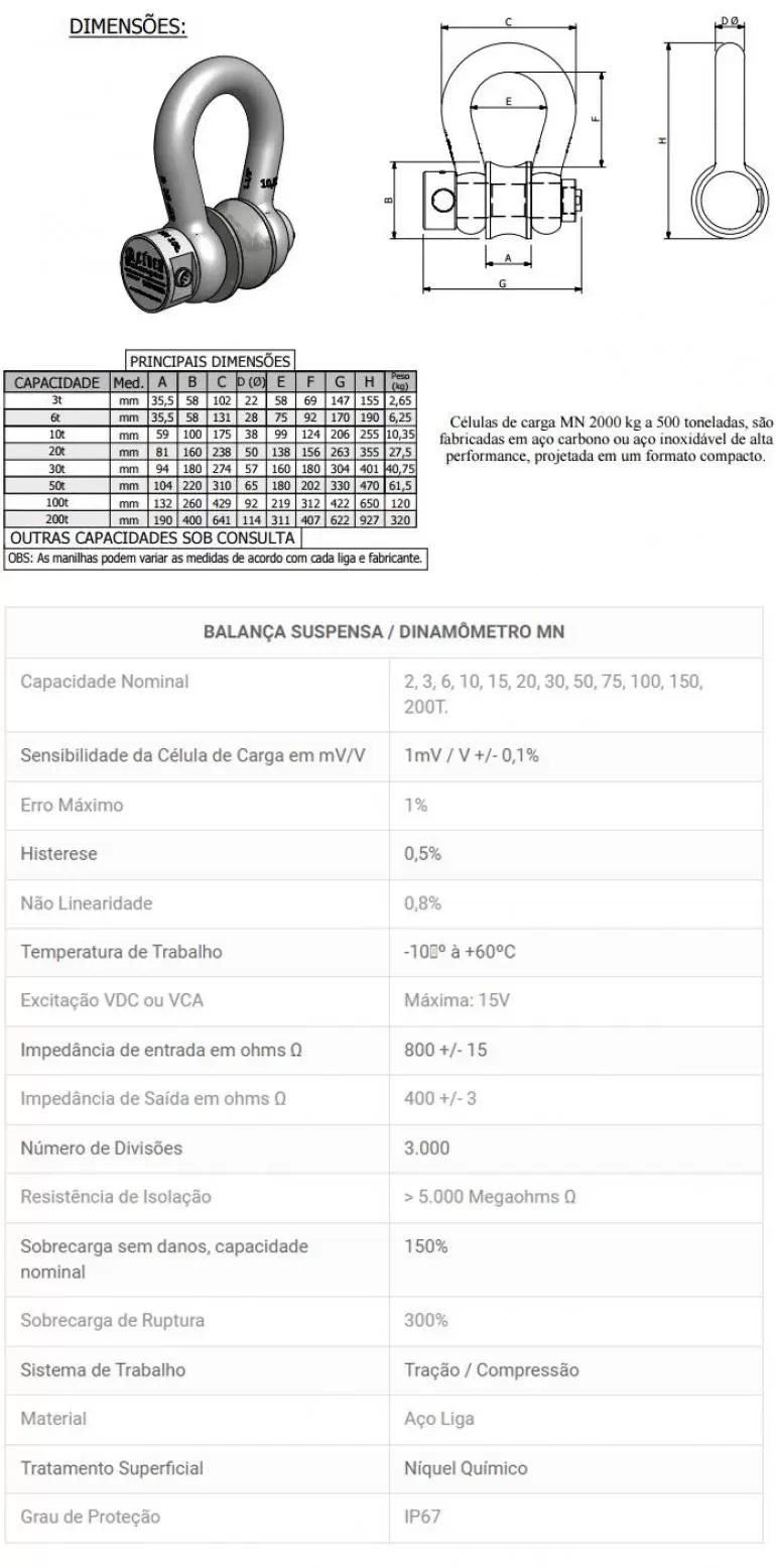 Balança Suspensa / Dinamômetro MN capacidade 3t a 200t