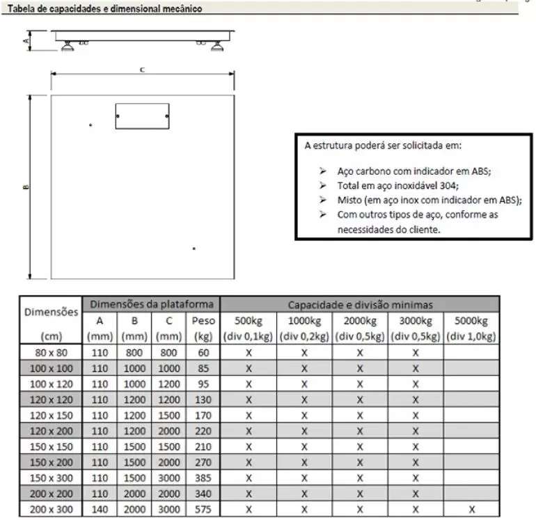 Pintado com tinta vinílica sintética industrial, garantindo alta resistência à oxidação, quando utilizada em ambientes adversos. Células de carga fabricadas em aço inox ou carbono com grau de proteção IP-67, são interligada ao indicador digital através de caixa de junção. Fabricação 100% nacional. Indicador digital construído ABS ou aço inoxidável AISI-304 com acabamento polido e grau de proteção IP-65 para instalação sobre mesa ou parede. Teclado em membrana, display de led de alto brilho com 6 dígitos de 15 mm.