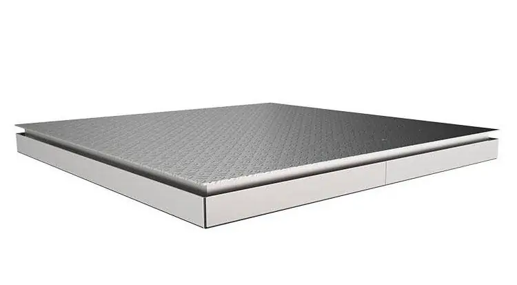 Plataforma de pesagem em aço, fabricada em perfis U dobrado, sendo a montagem da estrutura soldada nos alojamentos de fixação das células de carga. A plataforma superior poderá ser em chapa lisa ou xadrez conforme necessidade do cliente. Sistema com pés articulados esféricos ou oscilação esférica com quatro inferior, garantindo alinhamento e linearidade as células de carga, conseqüentemente, produzindo maior sensibilidade e precisão nas pesagens. Fixação das células de carga com dois parafusos de 12 mm em cada uma. Batentes de limitação de oscilação nos quatro cantos da plataforma de pesagem, totalmente ajustáveis em todos os sentidos de direção dos movimentos. Sistema de fixação da placa de junção em cima da plataforma, dinamizando o sistema de ajuste de cantos, facilitando consideravelmente o tempo de manutenção.