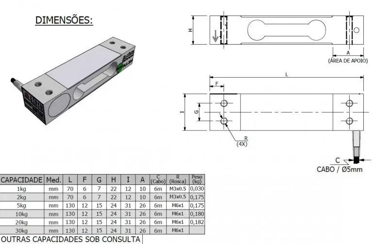 Célula de Carga PLA capacidade 1kg a 30kg