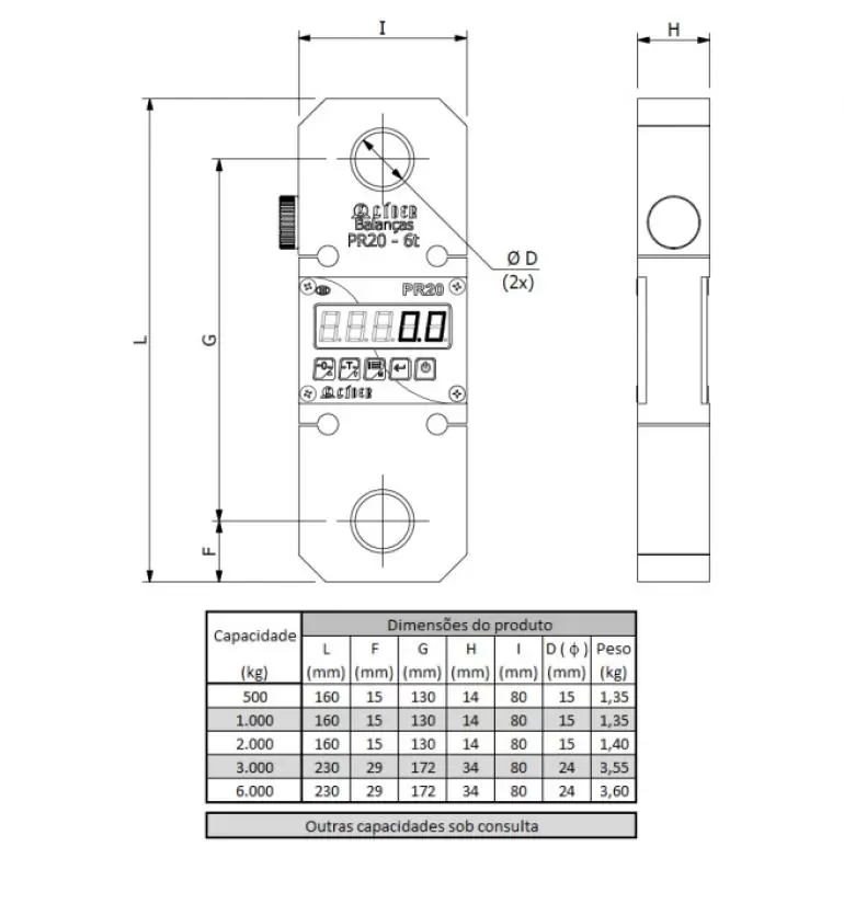Dimensões - Balança Suspensa / Dinamômetro PR20 capacidade 500kg a 6t