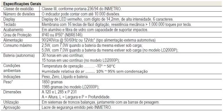 Indicador LD 2000E fabricado pela Líder Balanças é de última geração, realizando uma pesagem precisa e simplificada. Para o controle de peso de animais. Equipamento sem impressora. Equipamento de pesagem acoplado na maleta protetora para transporte, construída em fibra de vidro para suportar autos impactos e locais agressivos. O conjunto é dotado de display de leds vermelhos de alto brilho, um teclado de membranas para digitação de dados e um impressor. (opcional) com três tipos de relatório para análise das pesagens. Dez modos de pesagem de fácil operação, 13 funções de operação no teclado e saída paralela RS232. Auto alimentação externa automotiva 12 volts. Fornecida com cabos de bateria externa e cabo serial para conectar ao computador. Barras de pesagem com comprimento de 900mm e capacidade líquida de pesagem de 2000kg. Sobrecarga de até 4.000 kg.